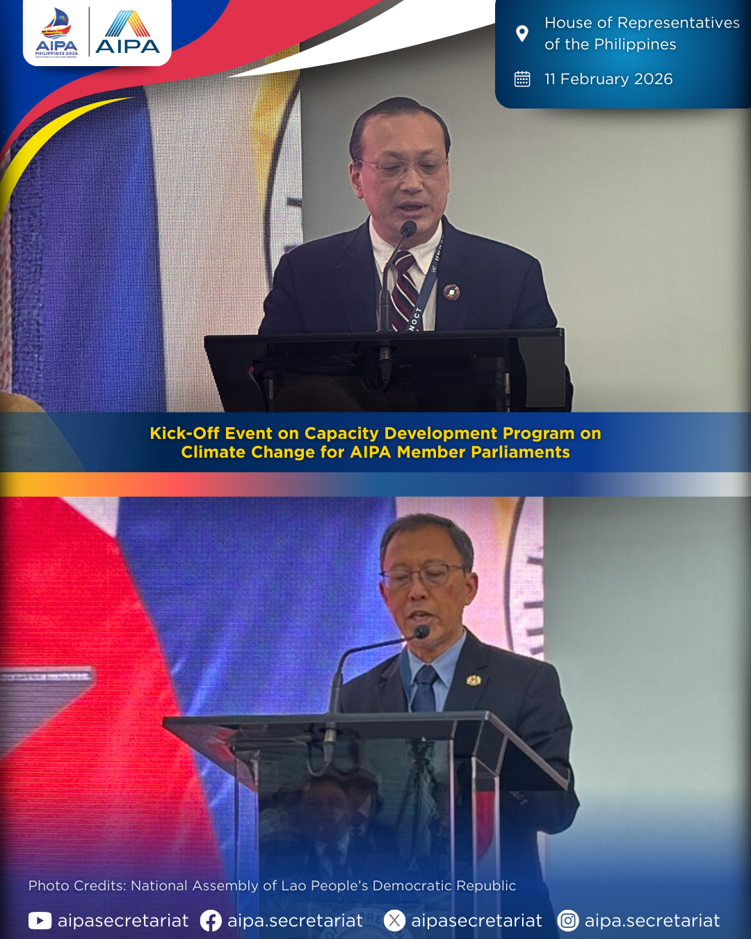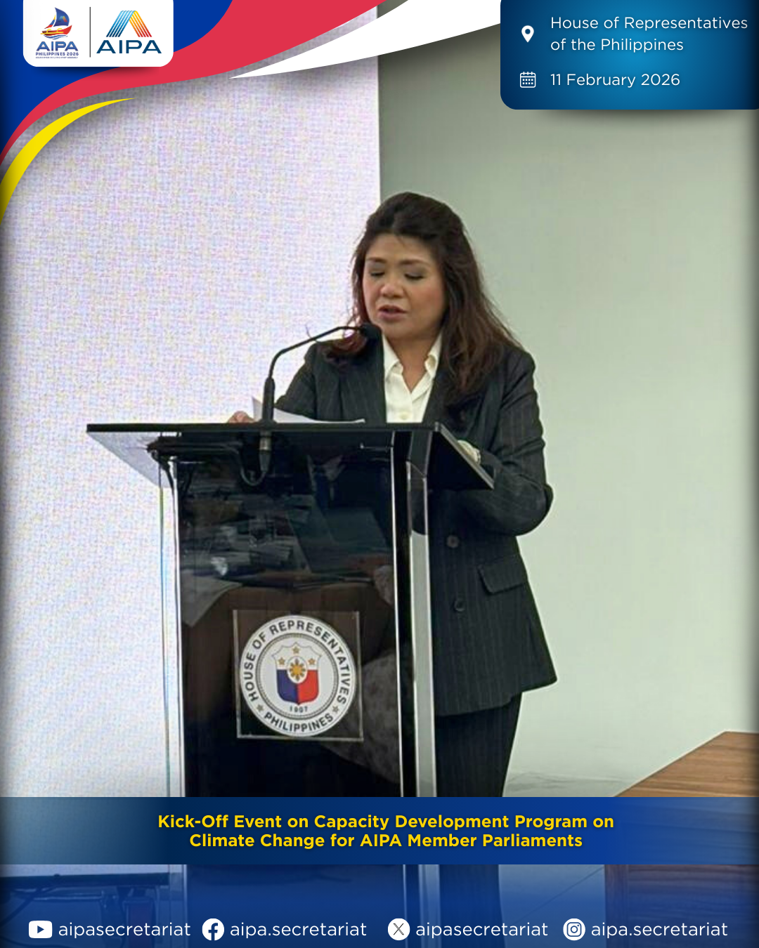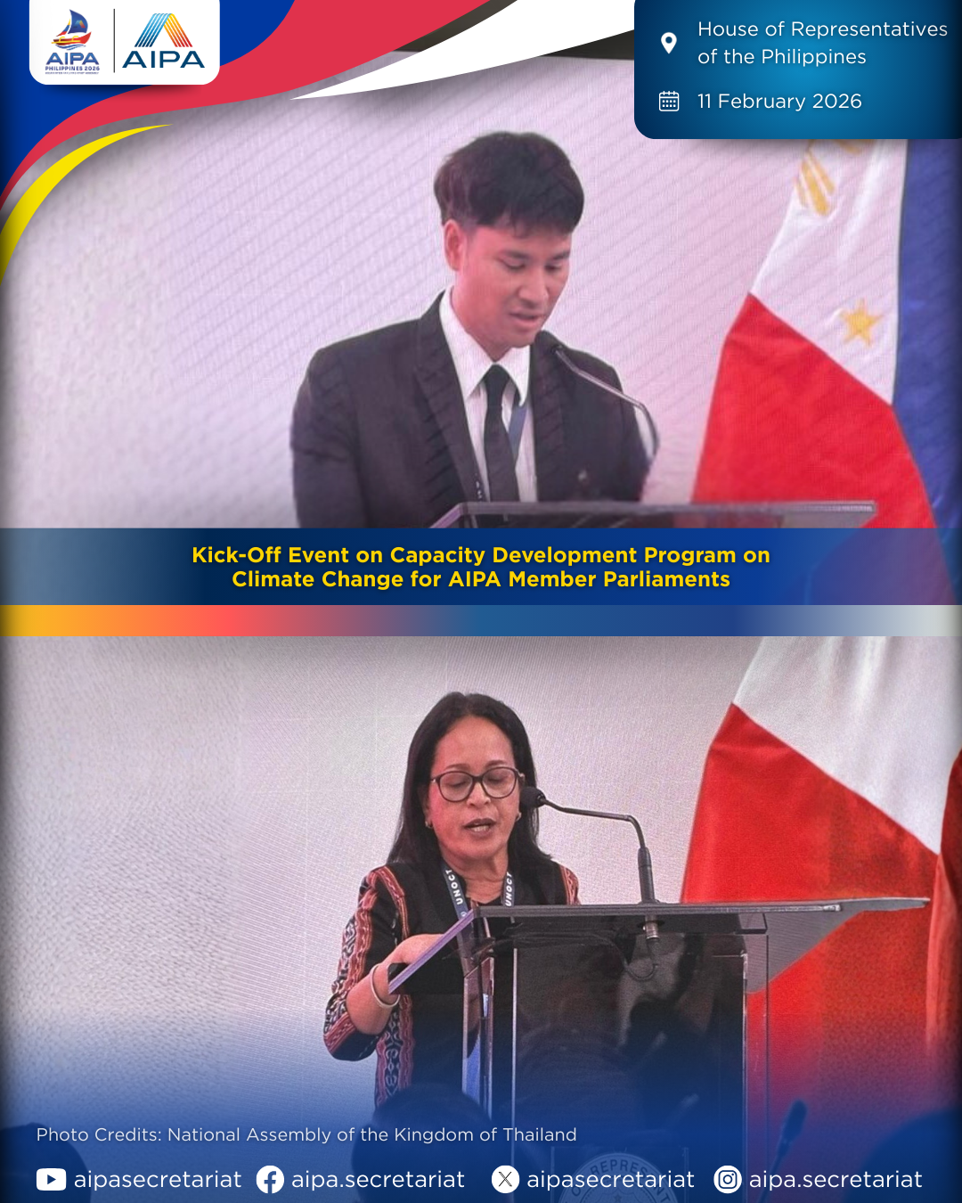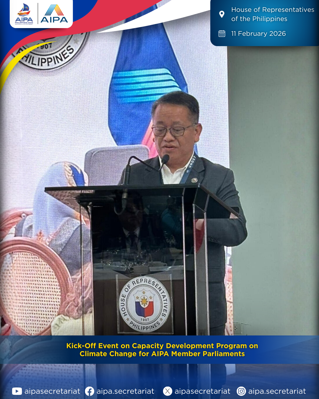 On 11 February 2026, the Capacity Development Program on Climate Change for AIPA Member Parliaments was officially launched at its Kick-Off Event in Manila, Philippines, jointly organised by the House of Representatives of the Philippines and AIPA.