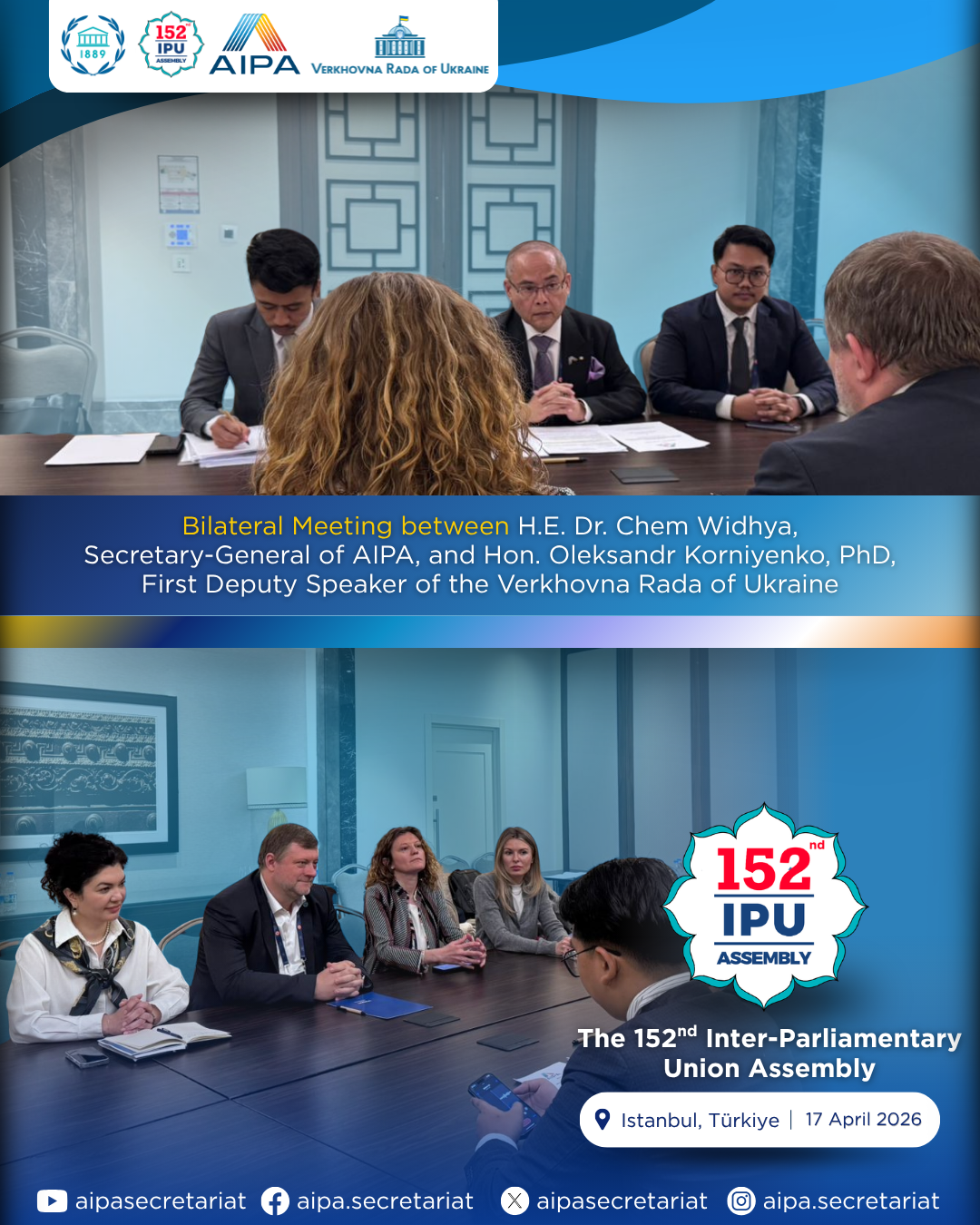 On 17 April 2026, H.E. Dr. Chem Widhya, Secretary-General of the ASEAN Inter-Parliamentary Assembly (AIPA), had a bilateral meeting with Hon. Oleksandr Korniyenko, PhD, First Deputy Speaker of the Verkhovna Rada of Ukraine, on the sidelines of the 152nd Inter-Parliamentary Union (IPU) Assembly in Istanbul, Türkiye.