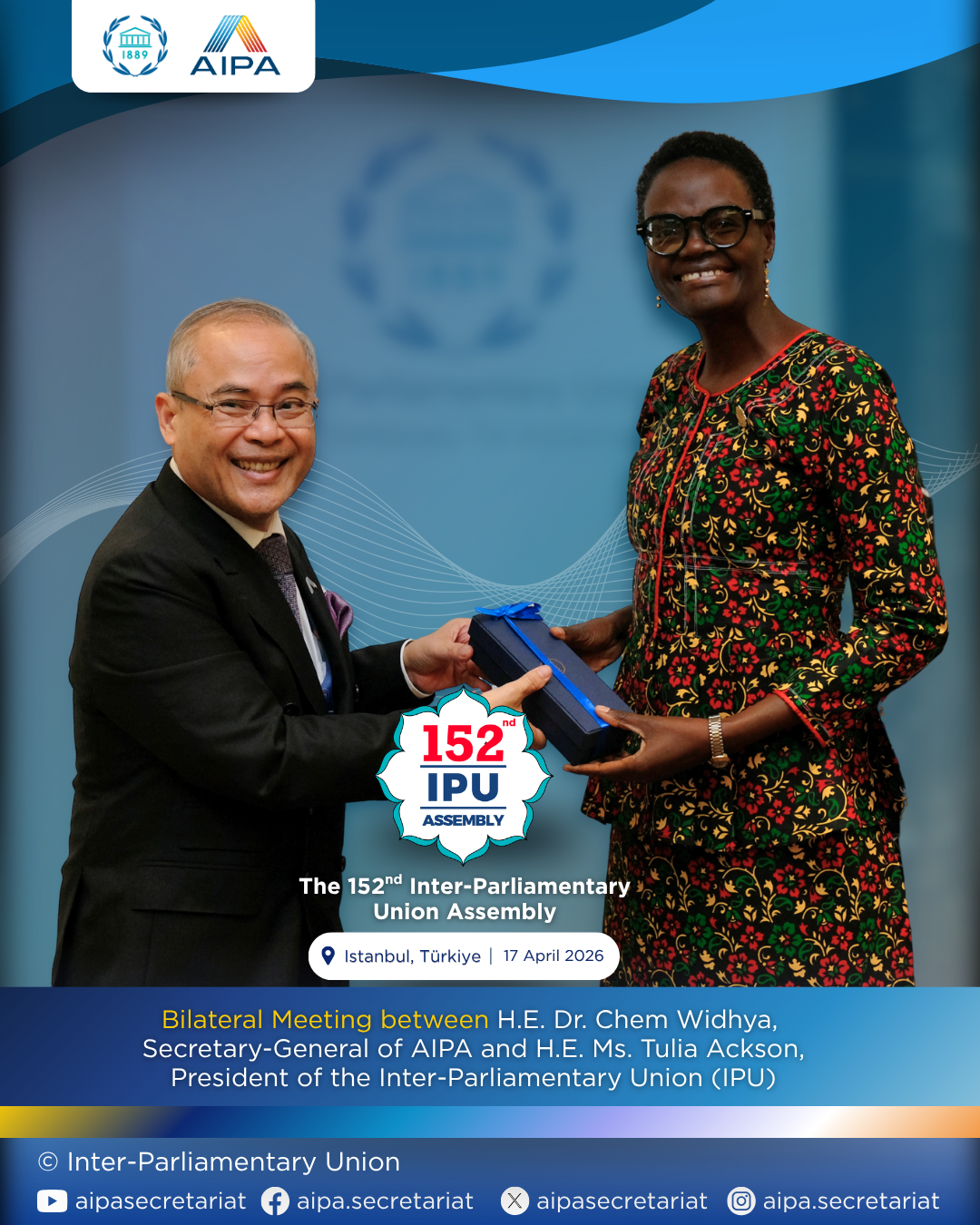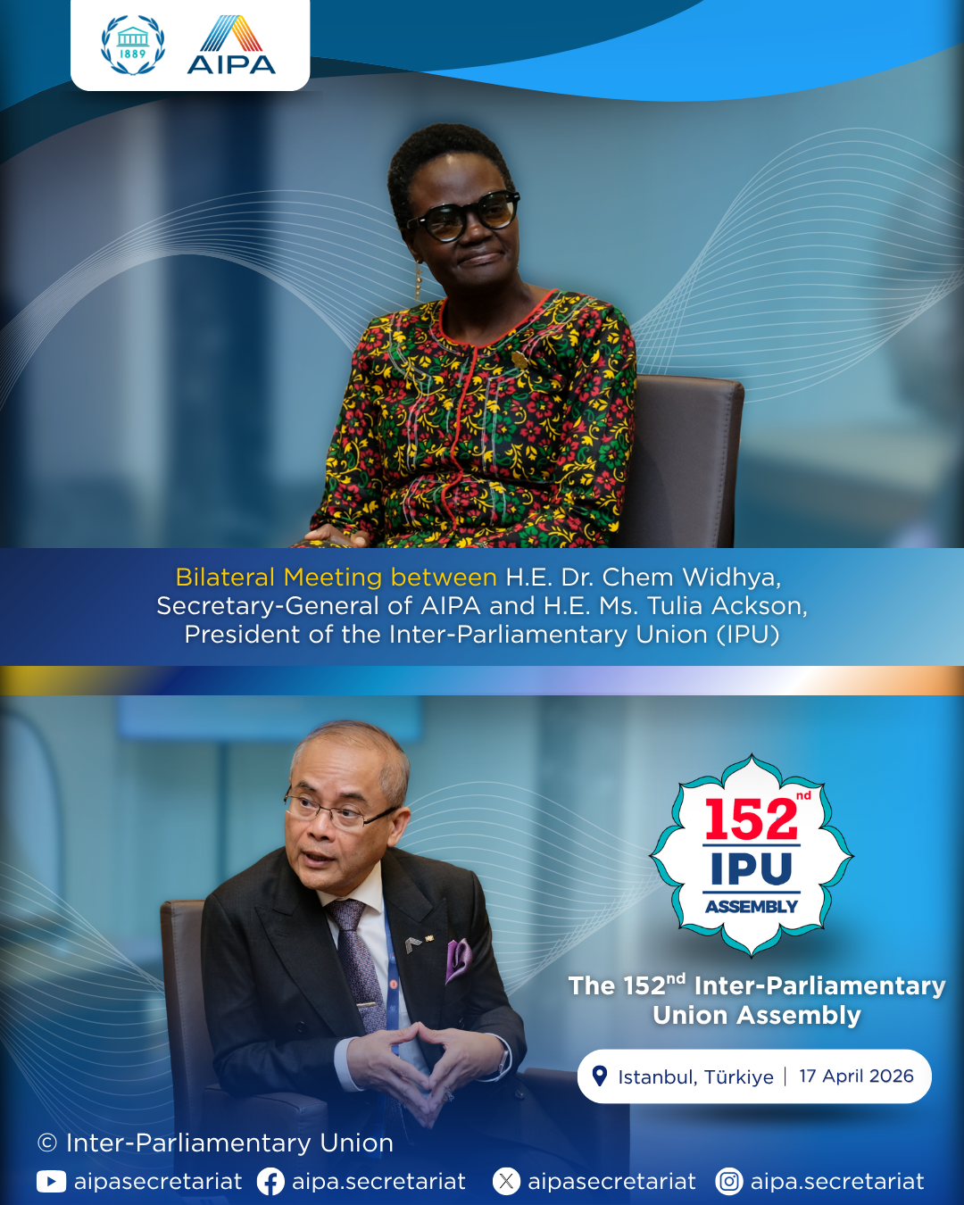 On 17 April 2026, H.E. Dr. Chem Widhya, Secretary-General of the ASEAN Inter-Parliamentary Assembly, had a bilateral meeting with H.E. Ms. Tulia Ackson, President of the Inter-Parliamentary Union, on the sidelines of the 152nd IPU Assembly in Istanbul, Türkiye.