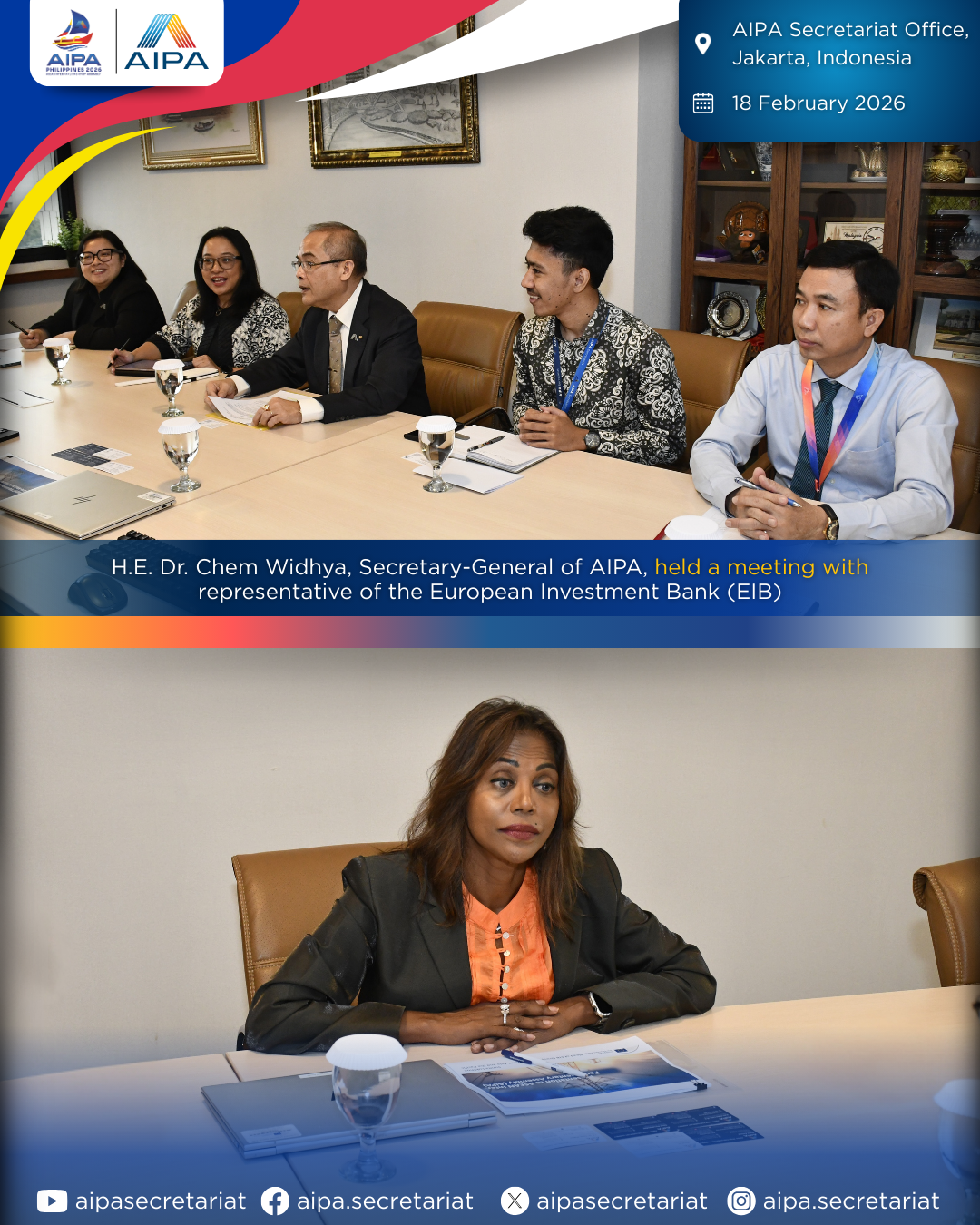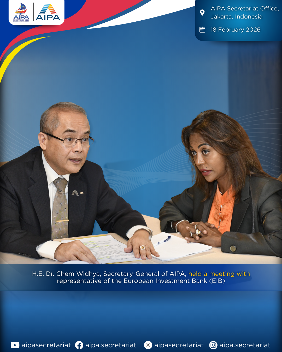 On 18 February 2026, H.E. Dr. Chem Widhya, Secretary-General of AIPA, held a meeting with representative of the European Investment Bank (EIB) at the AIPA Secretariat.