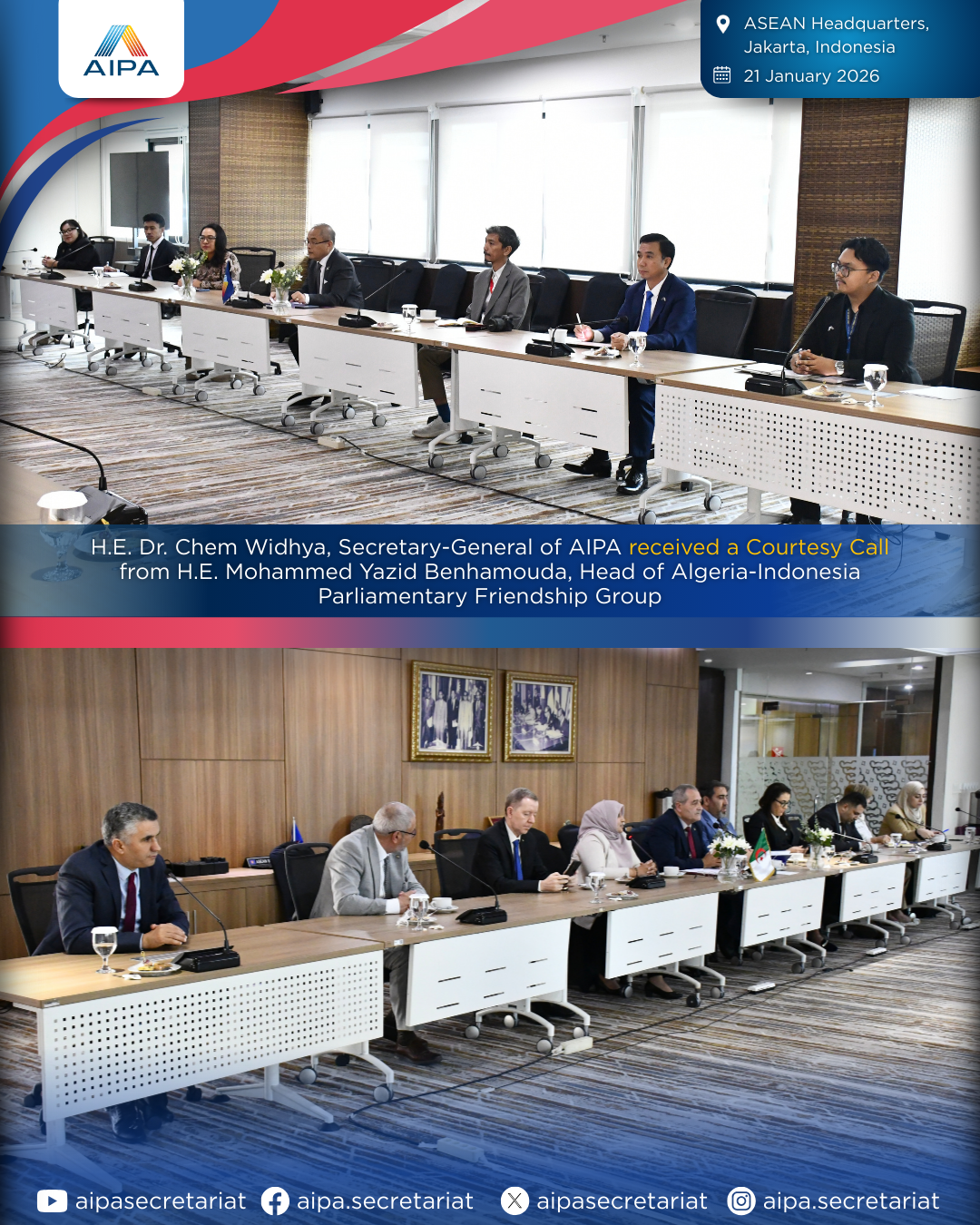 On 21 January 2026, H.E. Dr. Chem Widhya, Secretary-General of AIPA, received a courtesy visit from H.E. Mohammed Yazid Benhamouda, Head of the Algeria–Indonesia Parliamentary Friendship Group, and H.E. Osmane Abdelouahab, Ambassador of Algeria to ASEAN, together with the parliamentary delegation.