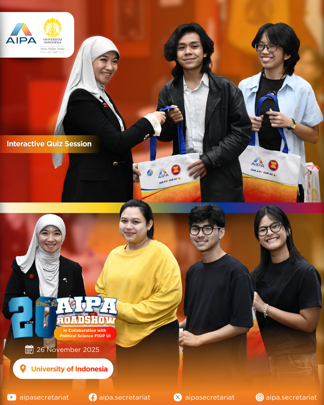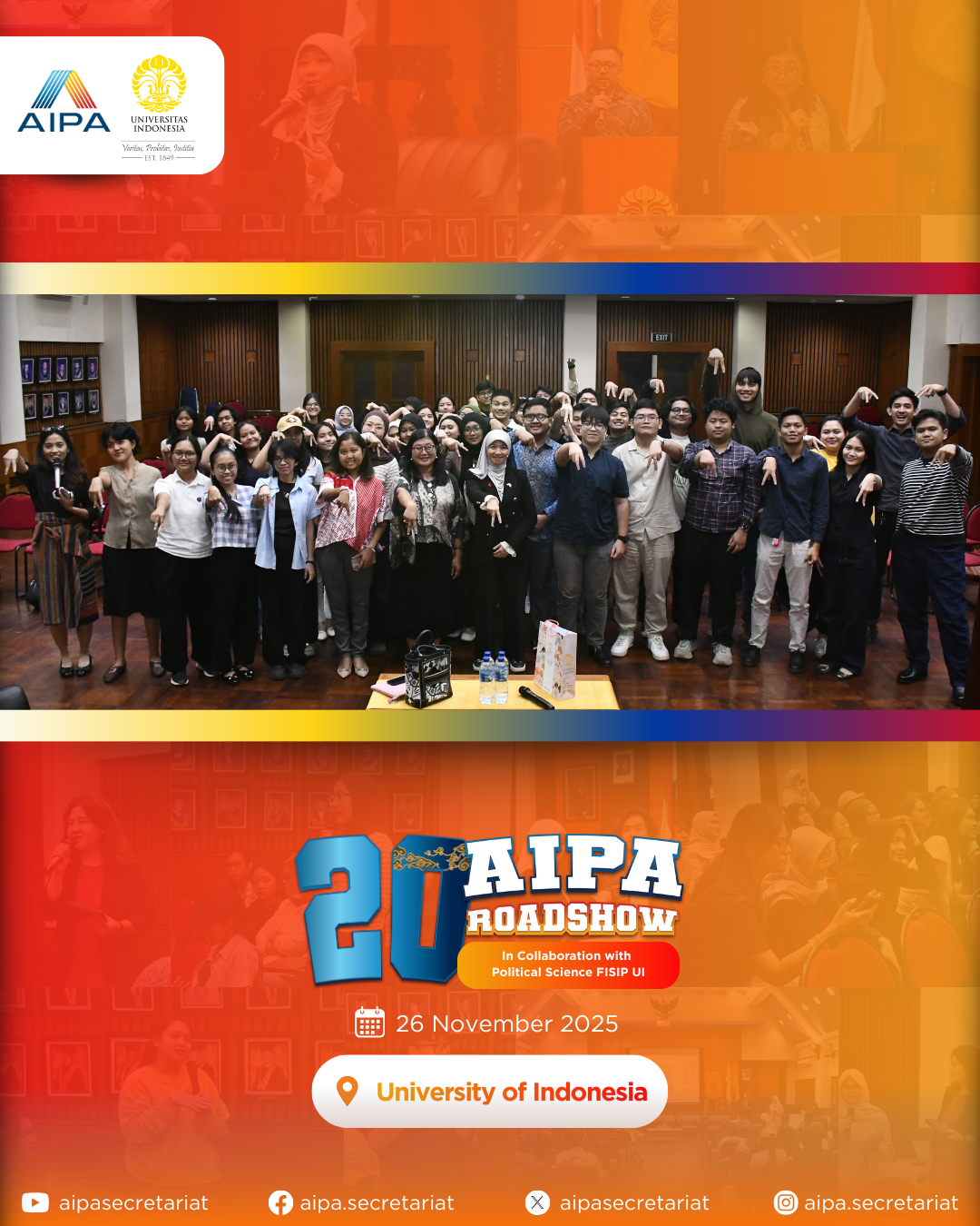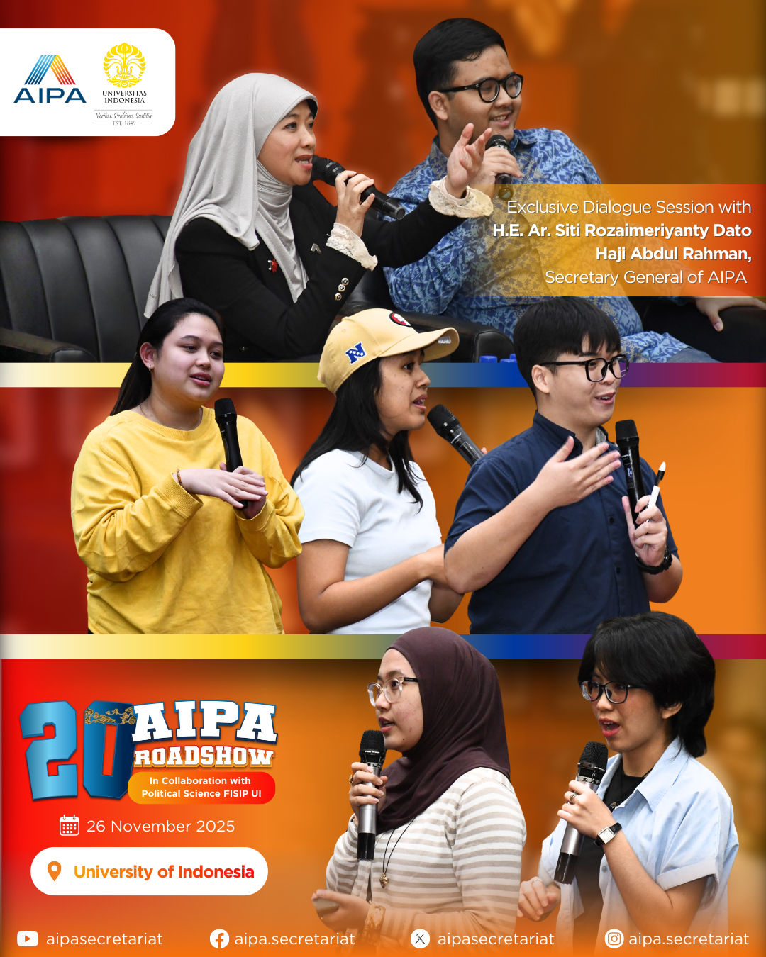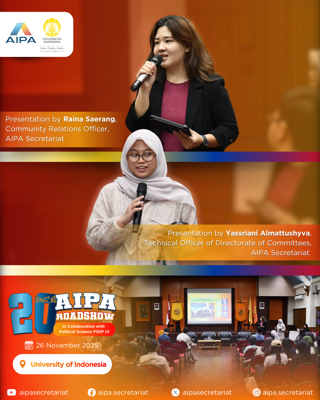 On 26 November 2025, the 20th AIPA Roadshow was successfully held at Universitas Indonesia, featuring dynamic presentations and an Exclusive Dialogue with the AIPA Secretary General, continuing AIPA’s mission to connect YOU(th) with the world of parliamentary diplomacy!