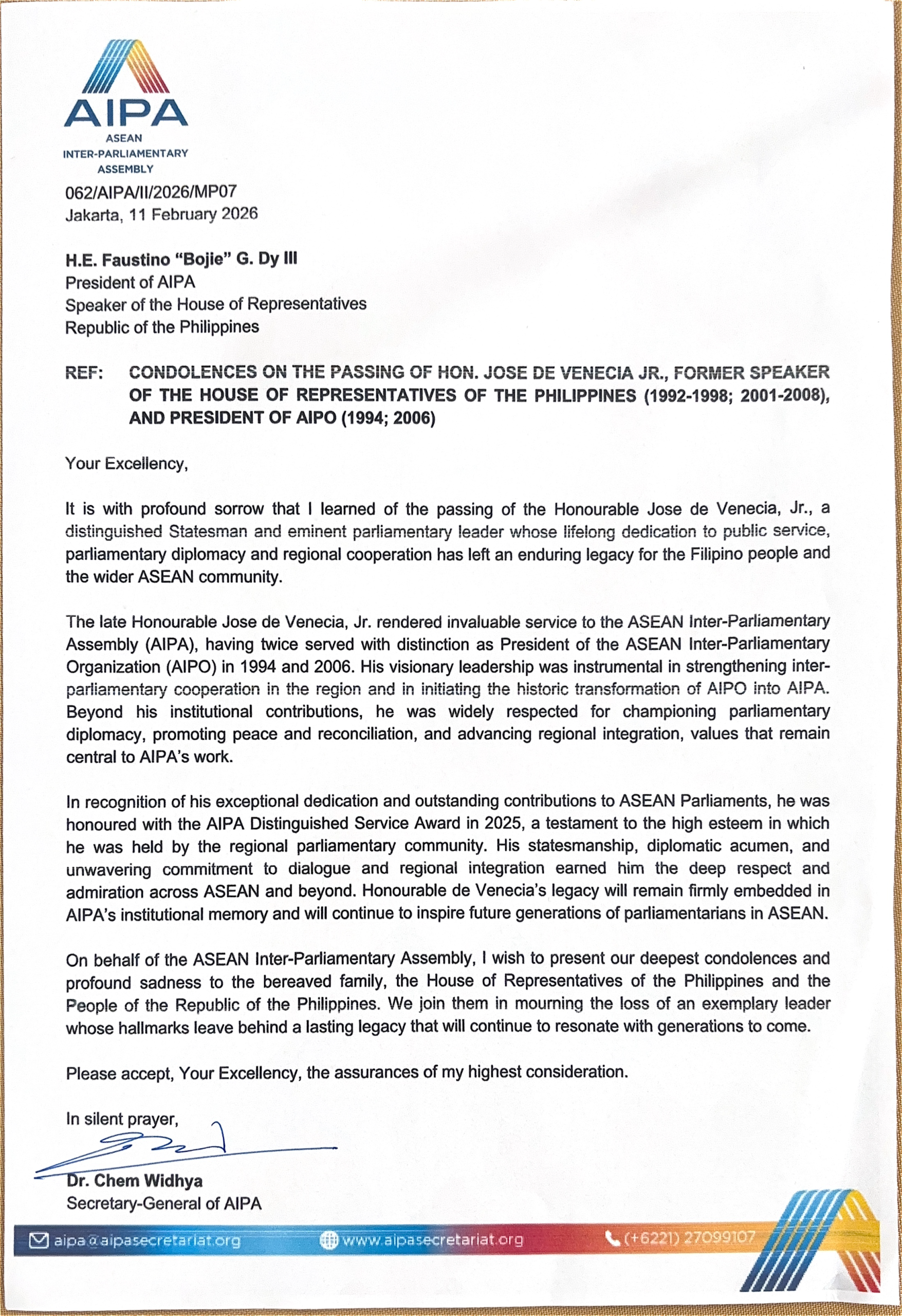 We are deeply saddened by the passing of Hon. Jose de Venecia Jr., a respected statesman and valued member of the AIPA family.